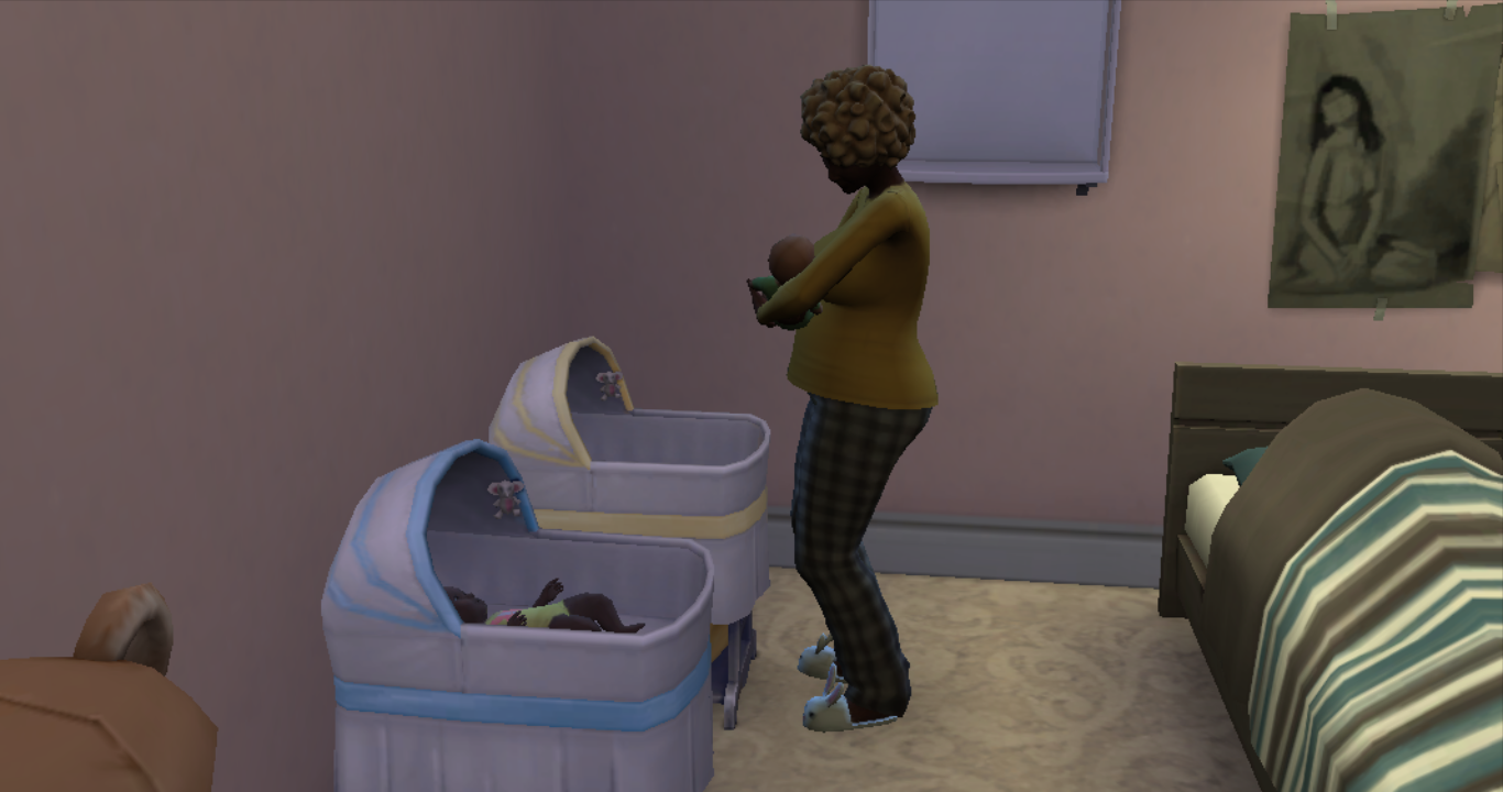 Oh great. (Sense the sarcasm there). Our first multiples of this legacy so happen to be in Generation 2 where we’re too poor and stressed out to actually care for them properly. Still, I suppose I should introduce these wonderful little gifts. First born is in the crib on the right, a little boy called Phillip. Our second born is on the left, a girl who rolled the name Yaretzi. For several days I called her nothing but ‘Y’ as I just couldn’t remember her name. Thankfully, I’m now a bit ahead in game to have remembered who she actually is (whoops! Poor kid). I really dislike multiples. They’re such a handful and when you have parents trying to also do other things, right at the start of a legacy, they’re such a stress. However, no more pregnancies are required and I can now roll for heir at some point.