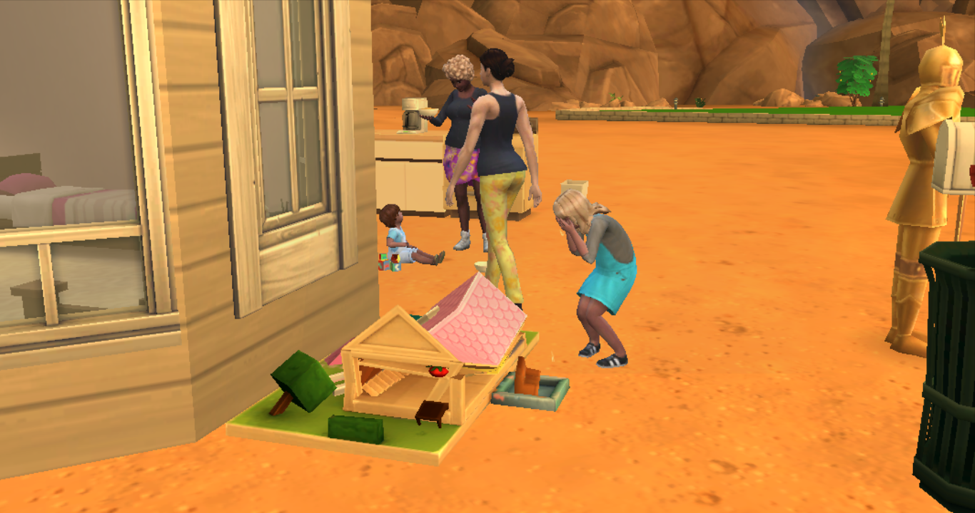 Yes, that’s right, Justine (Lexie’s best friend) kicks the dolls house in, infront of Helen, who gets a negative moodlet for it and starts crying. Way to go Justine, this mean body builder takes no prisoners.