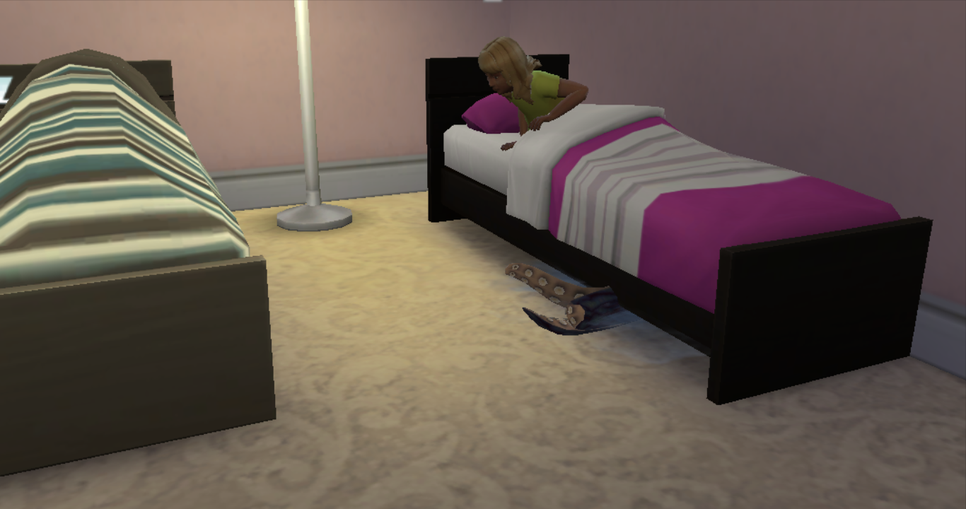 Meanwhile, it’s now 2am. Lucas hasn’t yet gone to bed as he’s been painting to try and get us some more money, but sightings of the monster under the bed persist. Now that all three kids share a room, things are made seemingly worse as if one sees it and wakes up, they all wake up. Leading to 1-2 hours of sim confusion. And of course, the negative moodlet doesn’t actually go unless they see the adult spray the monster. Gaaaaaaaah!!!